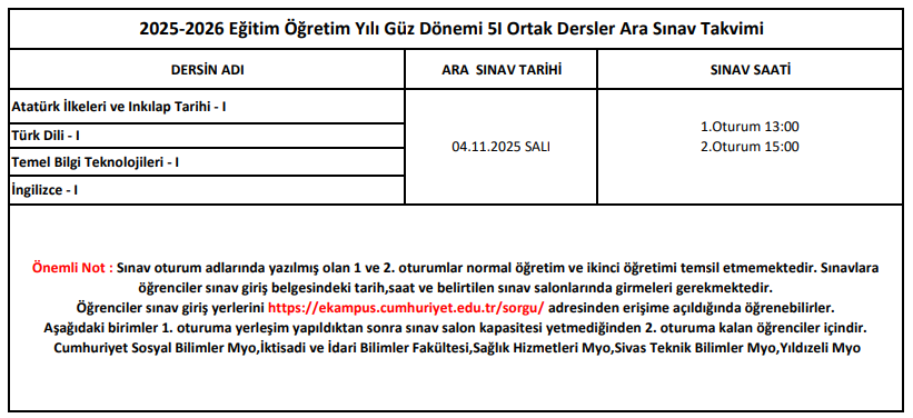 2025-2026 Eğitim öğretim yılı güz dönemi 5i ortak derslerinin ara sınav yerleşim yerleri https://ekampus.cumhuriyet.edu.tr/ linki üzerinden öğrencilerin erişimine açılmıştır. Sınav yer sorgulamada ismi çıkmayan ya da eksik dersi olan öğrencilerimiz fakültemiz sınav koordinatörlüğü ile iletişime geçebilir. Sınav fakültemiz ECZ 102 ve ECZ 107 nolu dersliklerinde yapılacaktır.