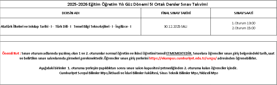 2025-2026 Eğitim Öğretim Yılı Güz Dönemi 5i Dersleri Final Sınavı Takvimi