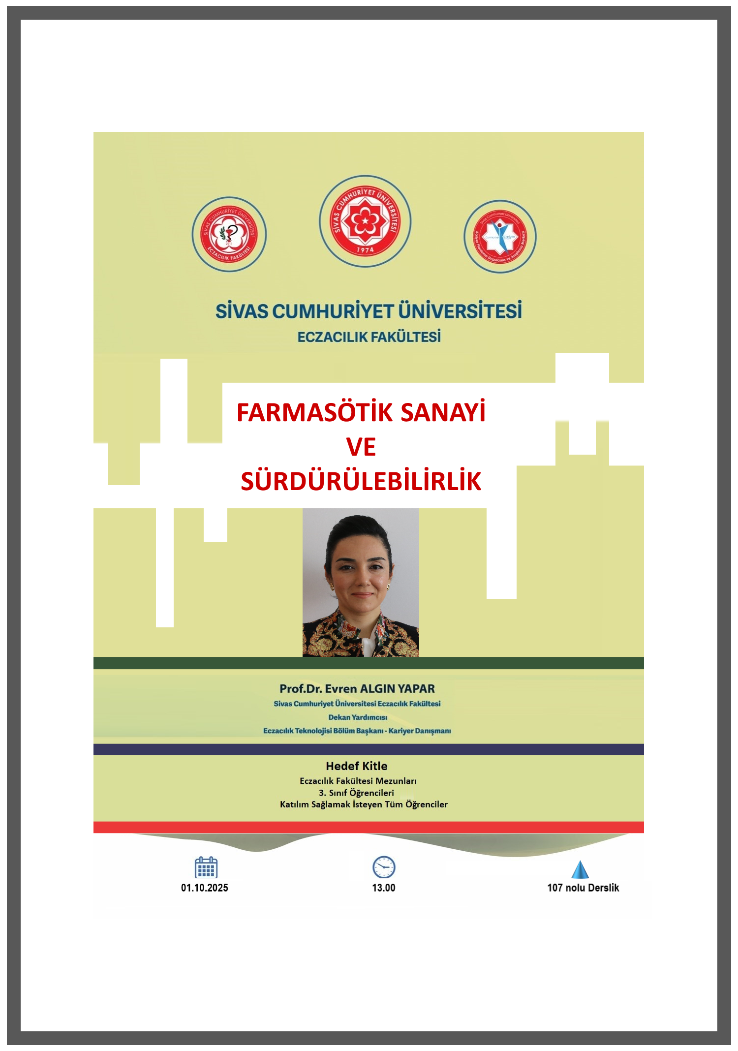 Fakültemiz kariyer danışmanlarından Prof. Dr. Evren ALĞIN YAPAR tarafından öğrencilerimize yönelik kariyer etkinliği programı kapsamında "Farmasötik Sanayi ve Sürüdürülebilirlik" konulu seminer gerçekleştirildi.