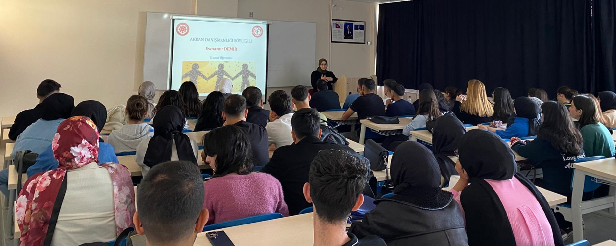Fakültemiz 5. Sınıf öğrencisi Esmanur DEMİR tarafından 08.10.2025 tarihinde "Akran Danışmanlığı" konulu söyleşi gerçekleştirilmiştir.