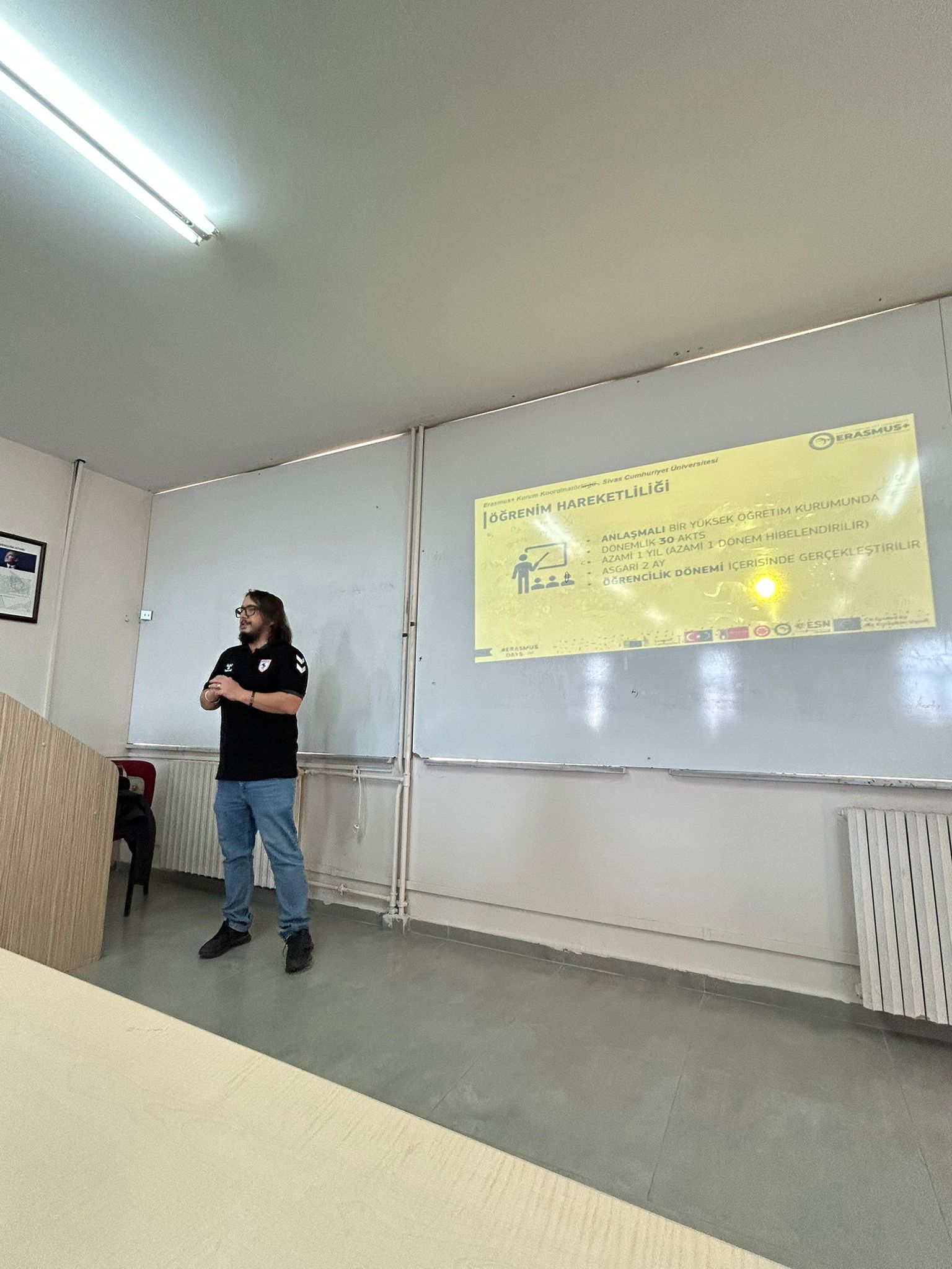 Fakültemiz öğrencilerine yönelik Erasmus+ Öğrenci Değişim Programı hakkında bilgilendirme toplantısı yapıldı. Üniversitemiz Erasmus+ Kurum Koordinatörlüğü Öğr. Gör. Emre SEVEN, öğrencilerimize Erasmus Programı hakkında bilgilendirmede bulundu. Toplantıda program başvuru şartları, süreçler, anlaşmalı üniversiteler ve öğrenci deneyimleri hakkında detaylı bilgi verildi.
