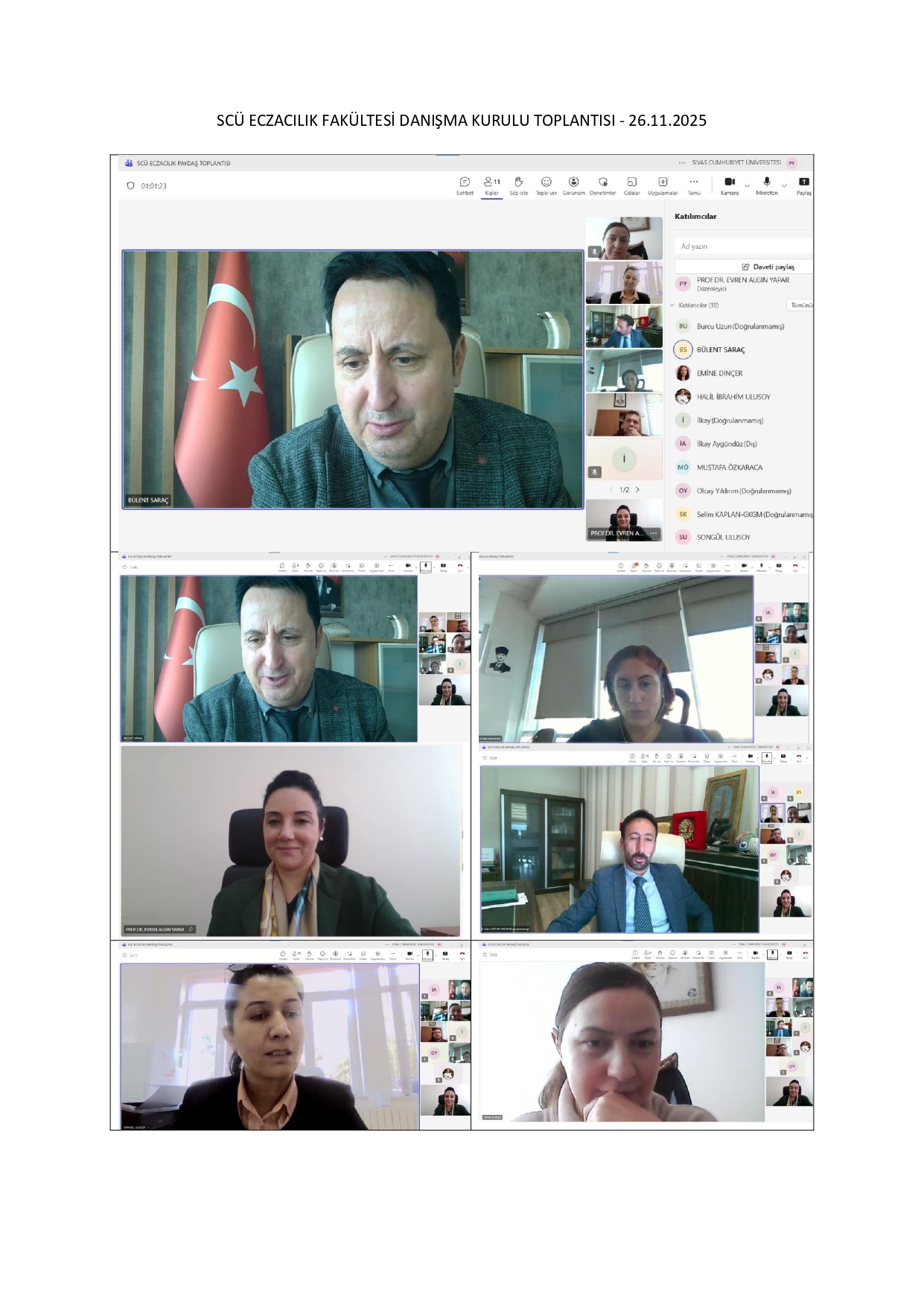 Fakültemiz Danışma Kurulu 26.11.2025 tarihinde Dekan Prof.Dr. Bülent SARAÇ başkanlığında dış ve iç paydaşlarımızın katılımı ile çevrimiçi olarak toplanmıştır. Toplantıda fakültemiz lisans eğitimi güncel müfredatı görüşülmüş, dış paydaş görüşleri doğrultusunda mezunlardan sahadaki güncel beklentilerin neler olacağı değerlendirilmiş ve mevcut müfredatın başarılı olduğu kanaati ile toplantı tamamlanmıştır.